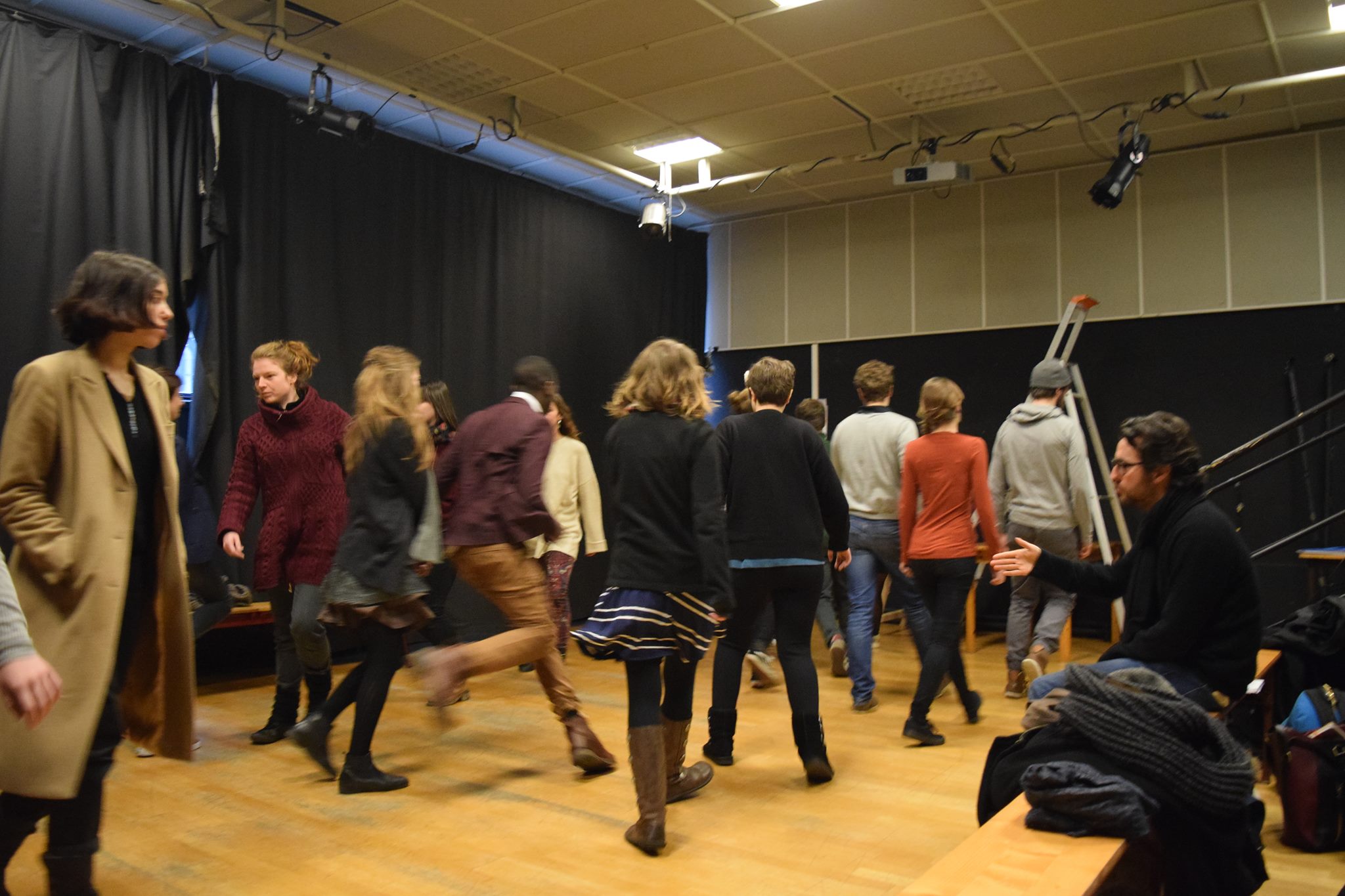 Tous les étudiants se précipitent sur le plateau, ils marchent, s’arrêtent, écoutent, continuent, Jean Bellorini les guide, leur parle de simplicité, de présence, d’ici et maintenant, il commente : « c’est juste, oui, continuez. ». Puis une idée lui vient en tête, les étudiants se rassoient, il amène une table au centre avec une bouteille vide dessus, fait une démonstration. C’est un exercice de présence. L’acteur entre, rencontre l’autre, le public, l’acteur d’un simple regard fait exister la bouteille et quand il le sent, la fait tomber, il laisse la bouteille résonner dans le silence, fait exister ce moment et disparaît. Comme une simple présence, comme un instant peut prendre tout à coup mille chemins possibles. La force du théâtre c’est peut-être ça. Une rencontre, un instant, unique, commun, éphémère. Alors merci Jean Bellorini d’être disponible, d’avoir envie et de donner envie d’y croire.