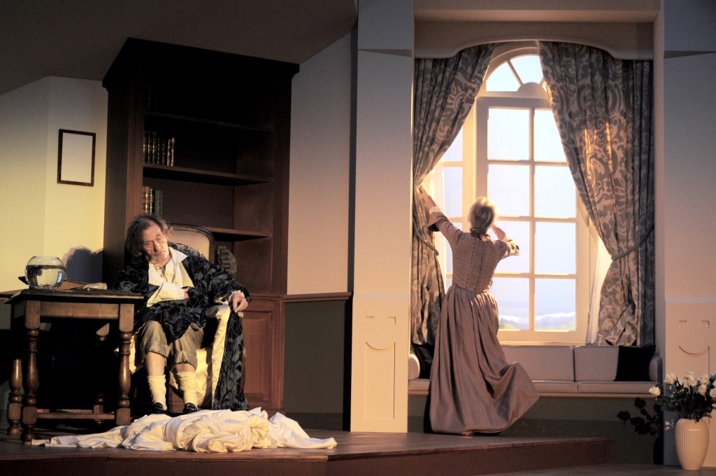 Serge Merlin, avec son génie de la scène, incarne ce personnage avec son brillant jeu d’acteur : les mains tremblantes, la voix sombre et rauque, des cris aigus… nous montre les multitudes d’états d’âme de son personnage. Misanthrope et misogyne, en attente de reconnaissance tout en outrageant ses admirateurs. Il s’agit d’un tyran domestique, médisant et violent ; philosophe dont le «Traité sur la destruction du monde» est connu internationalement.