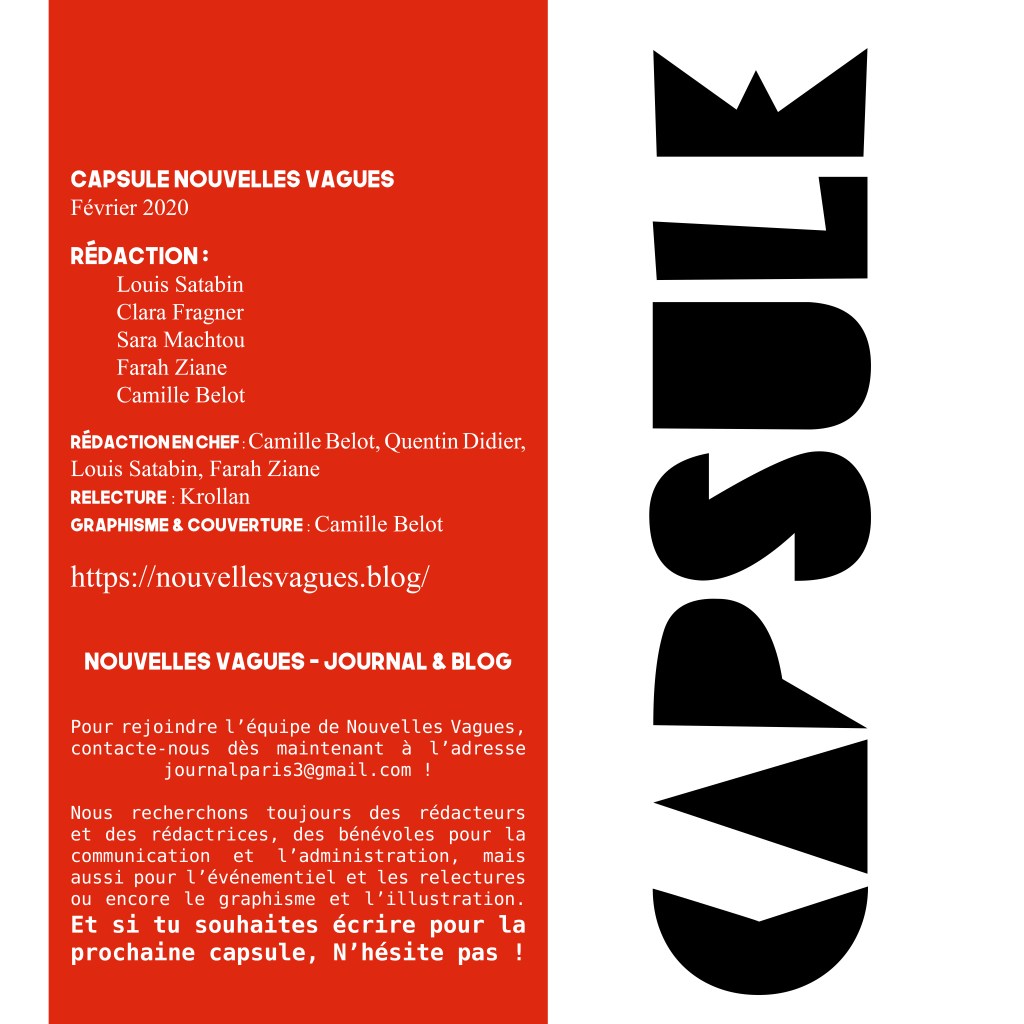 Sortie exceptionnelle de la capsule Nouvelles Vagues le 29 février 2020 – puisqu’il n’y a pas plus de jours, en effet. On vous souhaite une bonne lecture et on reste attentif à vos retours ! Et si vous souhaitez contribuer à la prochaine édition, n’hésitez pas à envoyer un petit mail à cette adresse : journalparis3@gmail.com