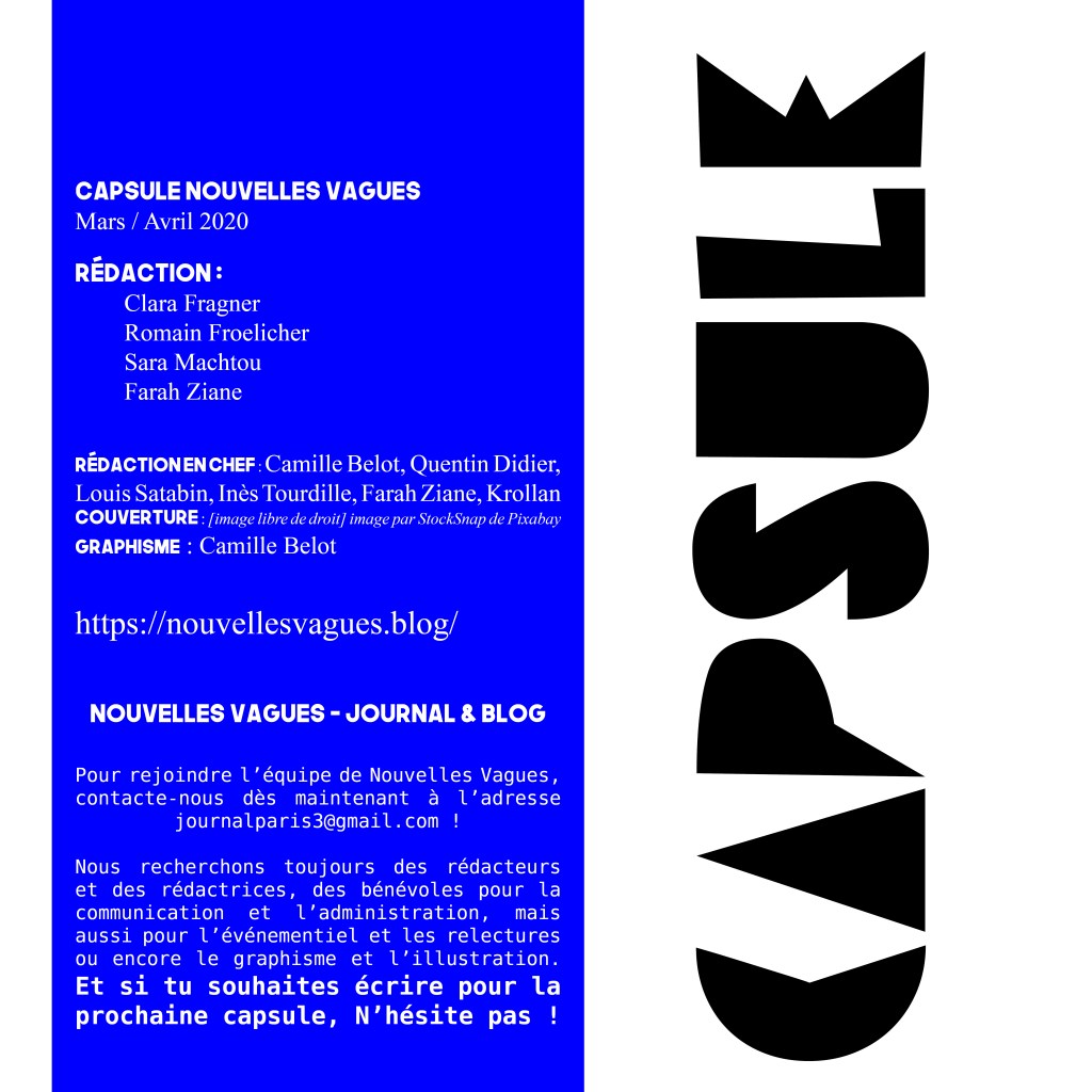 C’est dans les circonstances exceptionnelles que nous connaissons tou.te.s que nous publions cette nouvelle capsule qui fera office de capsule du mois de mars et du mois d’avril 2020. La situation est difficile pour tout le monde ; et nous espérons tout le meilleur pour vous. Restez bien chez vous si vous le pouvez. En vous souhaitant comme toujours une très bonne lecture ; on reste attentif à vos retours ; et si vous souhaitez contribuer à la prochaine édition, n’hésitez pas à envoyer un petit mail à cette adresse : journalparis3@gmail.com