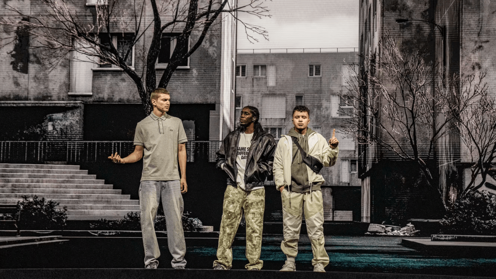 L’écran géant projette de nombreux décors au cours de la pièce, parmi ceux-ci les rues de Paris qu’arpentent nos trois protagonistes. Le Paris projeté semble d’abord inaccessible, auréolé d’une lumière irréelle et d’un graphisme qui souligne son caractère factice. Cependant, au cours du spectacle les contours de la ville projetée s’adoucissent et s’estompent à mesure que les personnages se l’approprient. Paris est donc à la fois le lieu du luxe, où vit Astérix qui déclare, comme si cela n’était pas évident à la vue de son appartement haussmannien, « La cité pour moi c’est du passé », et le lieu d’un regroupement possible. L’occasion de faire tomber les barrières sociales : « on est la France même si nous-même on s’exclut ». Le gap n’est pas insurmontable, et le metteur en scène semble nous inviter à le franchir, en se révoltant contre la mise au banc des banlieues, toujours aussi peu accessibles en transport et dans lesquelles une voiture autonome refuse de se rendre.