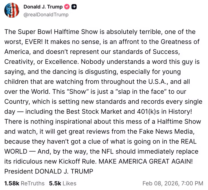 Bad Bunny n’a également pas échappé à la rage de Trump qui juge la prestation comme “l’une des pires” et “absolument horrible”. Son regard se ressent sur les danses de perreo jugées comme “dégoûtantes surtout pour les enfants”. À la lumière de la récente atrocité que constituent les dossiers Epstein, cela montre très clairement les préoccupations véhémentes que Donald Trump dit avoir pour les enfants. Ce Super Bowl 2026 heurte ainsi la réaction trumpiste au reste du monde, avec la vidéo du show cumulant près de 3,3 millions de j’aimes sur Youtube, son succès internationnal ne semble pas faire débat.